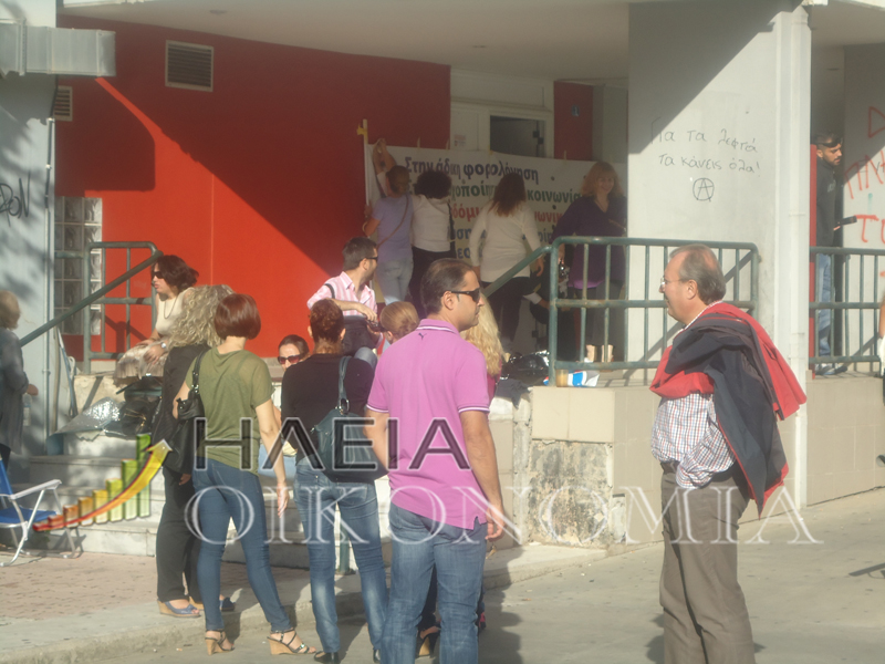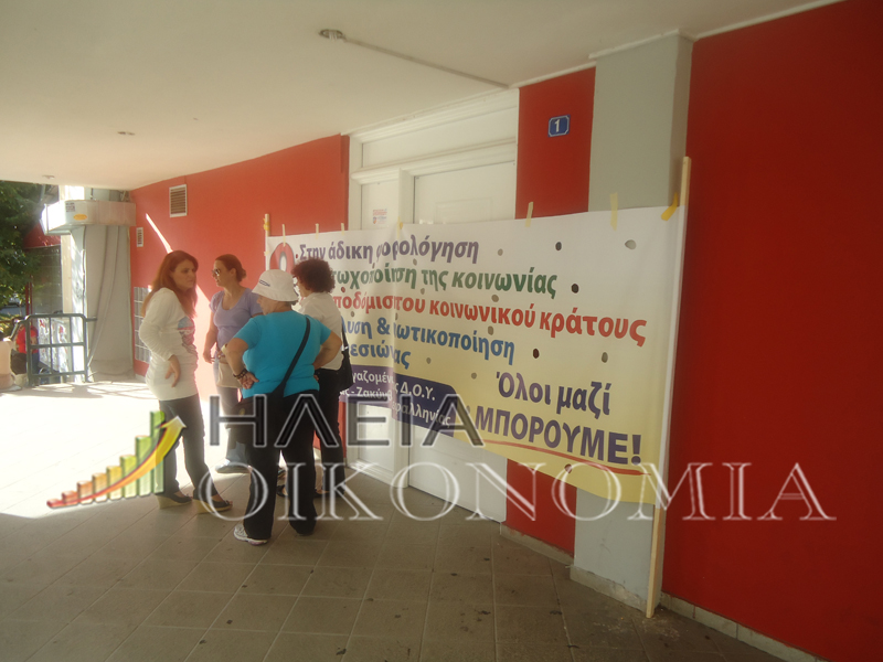 Οι εργαζόμενοι της ΔΟΥ Πύργου συμμετέχουν στην 24ωρη απεργία και ανέβασαν πανό έξω από το κτίριο.