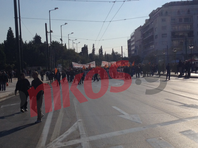Στη συνήθη τους θέση ετοιμότητας τα ΜΑΤ έξω από τη Βουλή, αναμένοντας την πορεία των ΓΣΕΕ-ΑΔΕΔΥ.