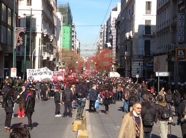 Σε εξέλιξη η μαθητική πορεία στο κέντρο της Αθήνας. Η πορεία βρίσκεται στην οδό Αιόλου, ενώ κλειστή είναι η Σταδίου.