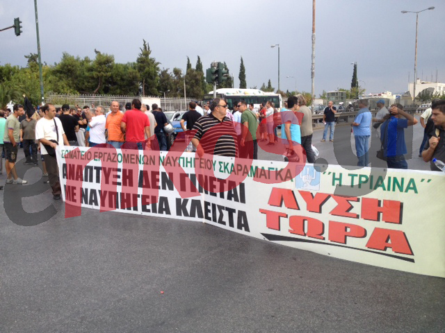 Τα σωματεία εργαζομένων στα ναυπηγεία Σκαραμαγκά έχουν κλείσει αυτή την ώρα, σε ένδειξη διαμαρτυρίας, και τα δύο ρεύματα της λεωφόρου Μεσογείων, στο ύψος του Υπουργείου Εθνικής Άμυνας.