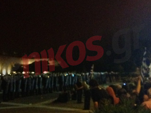 Μια ομάδα διαδηλωτών έχει περάσει τα κιγκλιδώματα και κάθεται μπροστά από τα ΜΑΤ, στο Μνημείο του Άγνωστου Στρατιώτη…