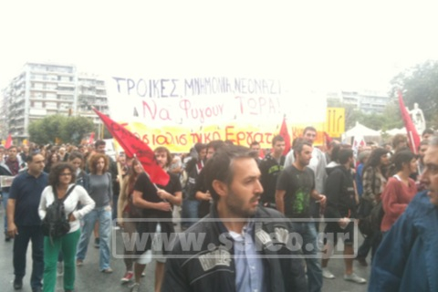 Η πορεία των διαδηλωτών αυτήν την στιγμή βρίσκεται στην οδό Αγίας Σοφίας. Οι διαδηλωτές υπολογίζονται περίπου στους 2.500 κρατώντας πανό συνδικάτων.