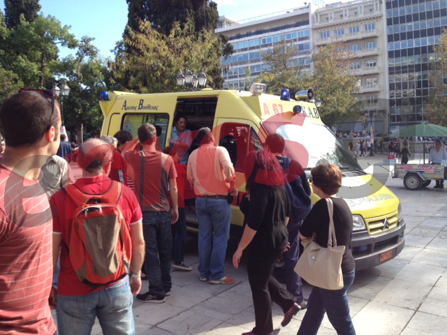 Στο νοσοκομείο οδηγείται -όπως φαίνεται και στις φωτογραφίες- διαδηλωτής, ο οποίος τραυματίστηκε νωρίτερα, κατά τη διάρκεια της πορείας στο κέντρο της Αθήνας.