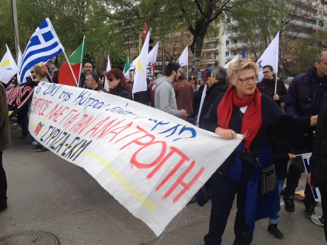Μέλη του ΣΥΡΙΖΑ έχουν συγκεντρωθεί κοντά στην εξέδρα των επισήμων κι ανήρτησαν πανό, ενώ υπάρχουν και μηνύματα συμπαράστασης στον Κυπριακό λαό.