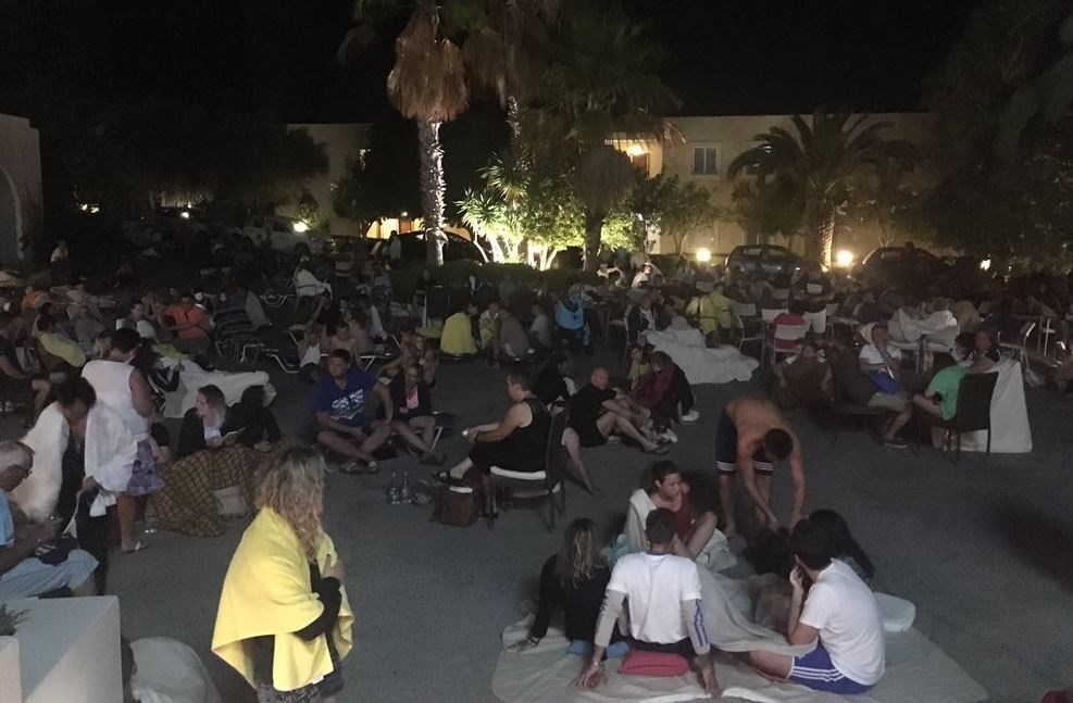 Ο κόσμος είναι φοβισμένος από τα πολλά Ρίχτερ που χτύπησαν περίπου πριν από τρεις ώρες το νησί και παραμένει εκτός σπιτιών, ξενοδοχείων και καταλυμάτων. Άλλοι κάθονται απλά κάτω, άλλοι σε καρέκλες που έχουν πάρει μαζί τους.