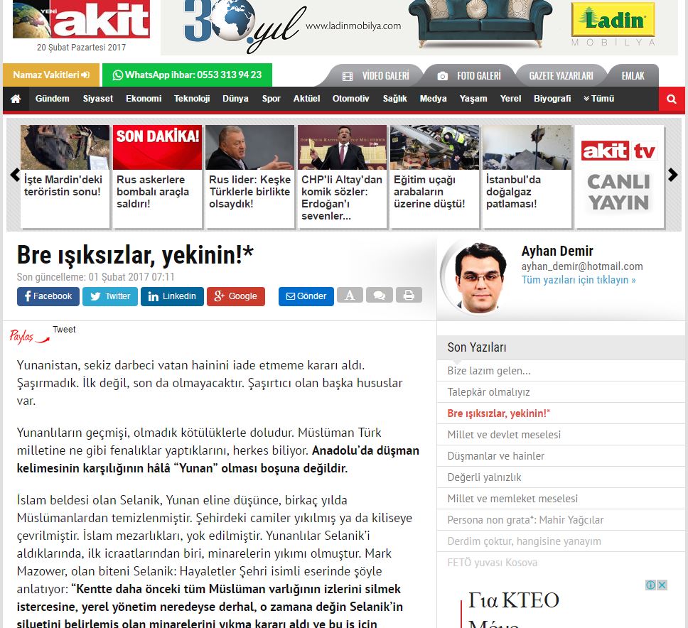 Ο αρθρογράφος της τουρκικής εφημερίδας, Yeni Akit, Αϊχάν Ντεμίρ προκαλεί.Σε σχόλιο του που δημοσιεύτηκε την 1η Φεβρουαρίου και αναδημοσιεύτηκε στην ιστοσελίδα, tourkikanea.gr, καλεί τον αρχηγό του τουρκικού ΓΕΕΘΑ, Χουλουσί Ακάρ, να κάνει σχέδια για την απελευθέρωση της Ξάνθης, της Κομοτηνής και της Θεσσαλονίκης τονίζοντας ταυτόχρονα ότι η «βόλτα» στα Ίμια ήταν σωστή, αλλά ελλιπής.Διαβάστε αναλυτικά το άρθρο: H Ελλάδα αποφάσισε να μην εκδώσει τους 8 πραξικοπηματίες προδότες. Δεν εκπλαγήκαμε. Ούτε η πρώτη φορά είναι ούτε η τελευταία. Άλλα είναι τα στοιχεία που εκπλήσσουν.Το παρελθόν των Ελλήνων είναι γεμάτο από απίστευτες ασχήμιες. Όλοι ξέρουν το τι κακίες έκαναν σε βάρος του τουρκικού έθνους. Δεν είναι τυχαίο ότι στην Ανατολία συνώνυμο του εχθρού είναι το ¨Έλληνας¨.Η Θεσσαλονίκη η πόλη του Ισλάμ, όταν έπεσε στα χέρια των Ελλήνων, εντός λίγων ετών εκκαθαρίστηκε από τους μουσουλμάνους. Τα τζαμιά της πόλης είτε γκρεμίστηκαν είτε μετατράπηκαν σε εκκλησίες. Τα ισλαμικά νεκροταφεία εξαφανίστηκαν. Όταν οι Έλληνες πήραν την Θεσσαλονίκη μια από τις πρώτες πράξεις τους ήταν το γκρέμισμα των μιναρέδων. Ο Μαρκ Μαζάουερ στο έργο του Θεσσαλονίκη-πόλη φαντασμάτων, περιγράφει ως εξής αυτά που έγιναν: ¨Σαν επιδιωκόταν το σβήσιμο όλης της μουσουλμανικής παρουσίας στην πόλη, η τοπική αυτοδιοίκηση σχεδόν αμέσως αποφάσισε να κατεδαφίσει τους μιναρέδες που καθόριζαν τότε την σιλουέτα της πόλης και κάλεσε εταιρίες να μετάσχουν σε αυτό το έργο.¨