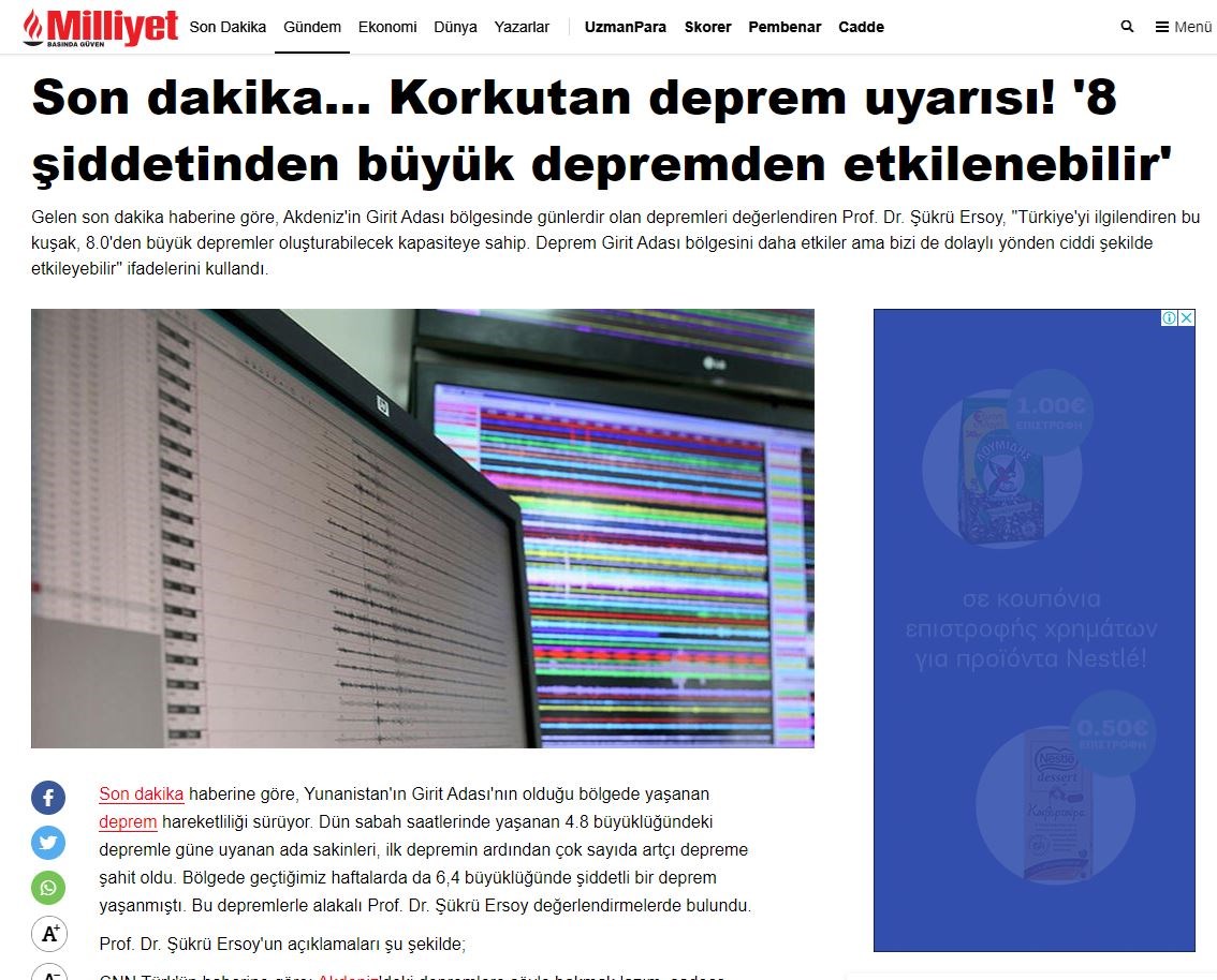 «Ένας τέτοιος σεισμός σεισμός θα επηρεάσει περισσότερο την Κρήτη, αλλά και την Τουρκία έμμεσα», είπε ακόμη ο κ. Ερσόι, ο οποίος, βέβαια, απέφυγε να προσδιορίσει τον χρόνο για την πρόβλεψή του.