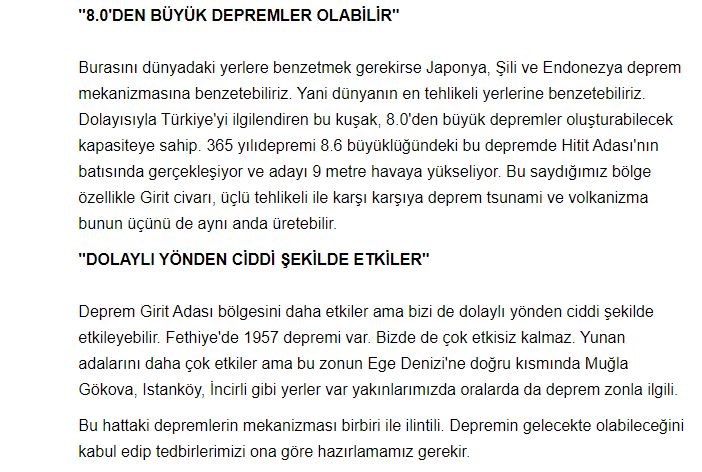 «Ίσως έχουμε έναν σεισμό της τάξεως των 8 Ρίχτερ», είπε χαρακτηριστικά ο Ερσόι και εξήγησε: «Η περιοχή ειδικά γύρω από την Κρήτη αντιμετωπίζει τριπλό κίνδυνο με σεισμό, τσουνάμι και έκρηξη ηφαιστειογενούς περιοχής που μπορούν να συμβούν ταυτόχρονα».