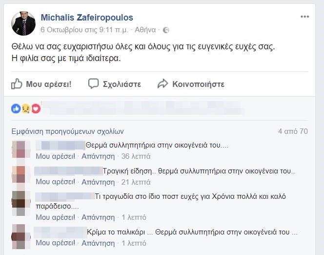 Μερικές φορές είναι περίεργα τα παιχνίδια που παίζει η μοίρα. Αυτό ισχύει και στην περίπτωση του δικηγόρου Μιχάλη Ζαφειρόπουλου, ο οποίος δολοφονήθηκε στο γραφείο του στο κέντρο της Αθήνας. Πριν από λίγες μέρες, συγκεκριμένα στις 6 Οκτωβρίου, ο εκλιπών είχε τα γενέθλια του. Δέχθηκε, λοιπόν, τις ευχές από τους διαδικτυακούς του φίλους, τους οποίους ευχαρίστησε με ξεχωριστή ανάρτηση. Η τραγική ειρωνεία είναι ότι στην ίδια ανάρτηση οι ίδιοι άνθρωποι εξέφρασαν τα συλλυπητήρια τους για τον χαμό του.