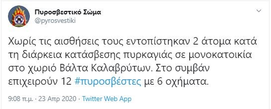 Σε ανάρτηση της στο Twitter η Πυροσβεστική υπηρεσία αναφέρει: “Χωρίς τις αισθήσεις τους εντοπίστηκαν 2 άτομα κατά τη διάρκεια κατάσβεσης πυρκαγιάς σε μονοκατοικία στο χωριό Βάλτα Καλαβρύτων. Στο συμβάν επιχειρούν 12 πυροσβέστες με 6 οχήματα”.