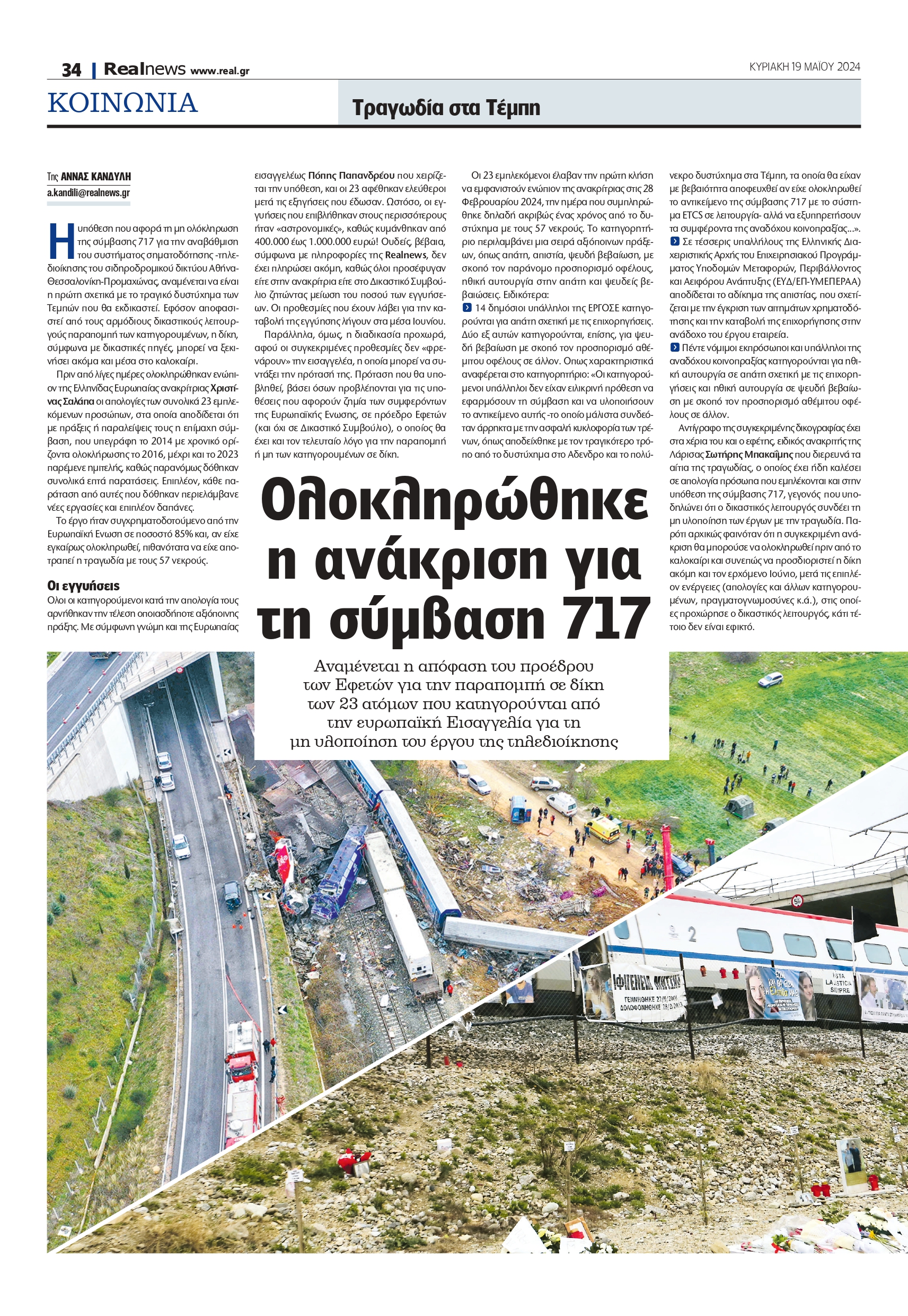 Αντίγραφο της συγκεκριμένης δικογραφίας έχει στα χέρια του και ο εφέτης, ειδικός ανακριτής της Λάρισας Σωτήρης Μπακαΐμης που διερευνά τα αίτια της τραγωδίας, ο οποίος έχει ήδη καλέσει σε απολογία πρόσωπα που εμπλέκονται και στην υπόθεση της σύμβασης 717, γεγονός που υποδηλώνει ότι ο δικαστικός λειτουργός συνδέει τη μη υλοποίηση των έργων με την τραγωδία. Παρότι αρχικώς φαινόταν ότι η συγκεκριμένη ανάκριση θα μπορούσε να ολοκληρωθεί πριν από το καλοκαίρι και συνεπώς να προσδιοριστεί η δίκη ακόμη και τον ερχόμενο Ιούνιο, μετά τις επιπλέον ενέργειες (απολογίες και άλλων κατηγορουμένων, πραγματογνωμοσύνες κ.ά.), στις οποίες προχώρησε ο δικαστικός λειτουργός, κάτι τέτοιο δεν είναι εφικτό.