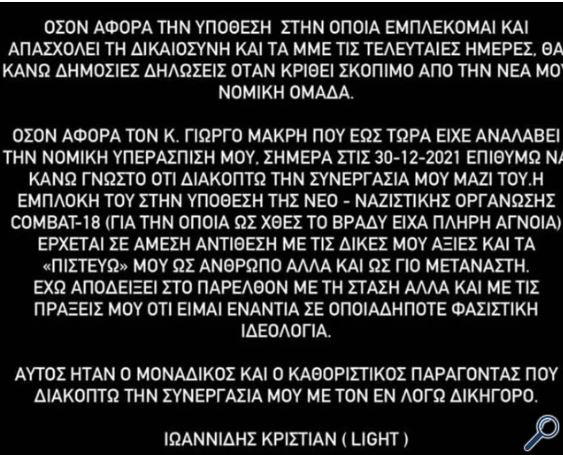 “Όσον αφορά στην εμπλοκή μου στην υπόθεση που απασχολεί τη δικαιοσύνη και τα ΜΜΕ, θα κάνω δηλώσεις όταν κριθεί σκόπιμο από τη νέα μου νομική ομάδα. Όσον αφορά τον κ. Γιώργο Μακρή που έως τώρα είχε αναλάβει τη νομική υπεράσπιση μου, σήμερα επιθυμώ να κάνω γνωστό πως διακόπτω τη συνεργασία μου μαζί του. Η εμπλοκή του στην υπόθεση της νεο-ναζιστικής οργάνωσης COMBAT-18 (για την οποία ως χθες το βράδυ είχα πλήρη άγνοια) έρχεται σε άμεση αντίθεση με τις δικές μου αξίες και τα “πιστεύω” μου ως άνθρωπο αλλά και ως γιο μετανάστη. Έχω αποδείξει στο παρελθόν με τη στάση αλλά και με τις πράξεις μου ότι είμαι ενάντια σε οποιαδήποτε φασιστική ιδεολογία”.