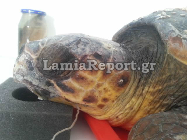 Η χελώνα έχει καταπιεί αγκίστρι και φέρει βαρύ τραύμα στο κεφάλι από χτύπημα, με κάποιο βαρύ όργανο, μετά τη σύλληψή της σε παραγάδι ψαρά. Η χελώνα είχε μήκος περί τα 45 εκατοστά και βάρος 10 κιλά.Πηγή: lamiareport.gr