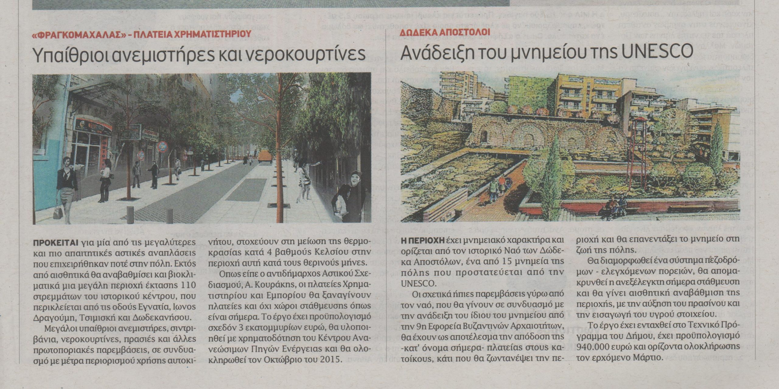 Οι εργασίες ξεκινούν άμεσα, την ερχόμενη εβδομάδα, τόσο στο συγκεκριμένο έργο όσο και σε άλλες δύο μεγάλης κλίμακας αστικές αναπλάσεις που βάζει μπροστά ο δήμος Θεσσαλονίκης, όπως ανακοίνωσε στο δημοτικό συμβούλιο ο αρμόδιος αντιδήμαρχος Ανδρέας Κουράκης: Αυτή της Πλατείας Χρηματιστηρίου, με πρωτοποριακές οικολογικές παρεμβάσεις που θα βελτιώσουν το μικροκλίμα στο λεγόμενο «Φραγκομαχαλά» και αυτή της ιστορικής περιοχής των Δώδεκα Αποστόλων.