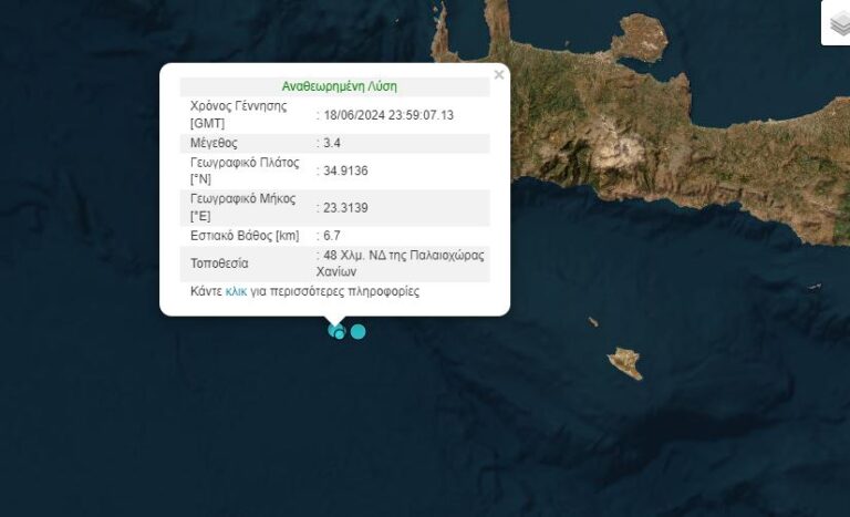 Τρεις σεισμοί από 3 έως 3,4 Ρίχτερ σημειώθηκαν μέσα σε λίγα λεπτά ανοιχτά της Κρήτης
