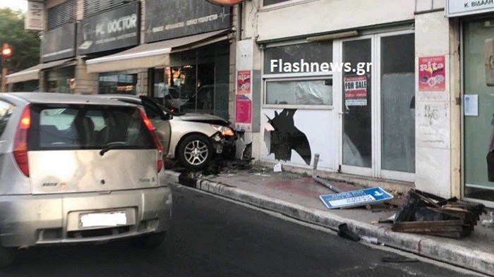 Η σύγκρουση ήταν τόσο σφοδρή που η ταμπέλα που βρισκόταν στο πεζοδρόμιο ξεκόλλησε ενώ προκλήθηκαν υλικές ζημιές σε δύο καταστήματα.