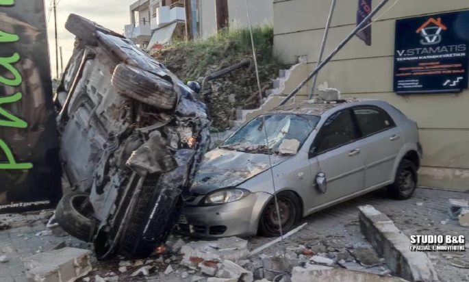 Εικόνες καταστροφής στο Ναύπλιο λόγω τροχαίου που συνέβη στην επαρχιακή οδό Ασκληπιού. Ένα αυτοκίνητο έκανε… τρελή πορεία προσκρούοντας σε ΚΑΦΑΟ, σε κολώνα, γκρεμίζοντας μία μάντρα και πέφτοντας πάνω σε σταθμευμένα οχήματα έξω από φούρνο.