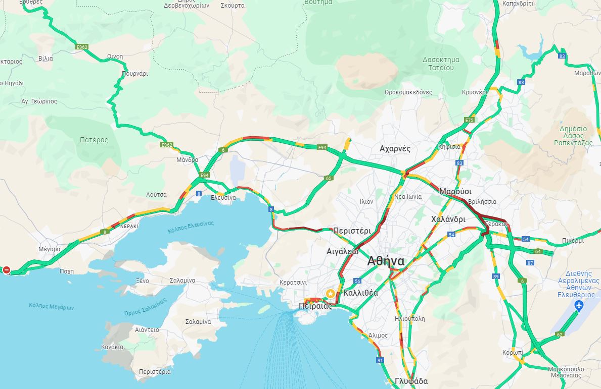 Παράλληλα ιδιαίτερα αυξημένη είναι η κίνηση στη λεωφόρο Αθηνών, από το Χαϊδάρι έως τα διυλιστήρια καθώς και στη λεωφόρο Σχιστού στο ύψος του Σκαραμαγκά.