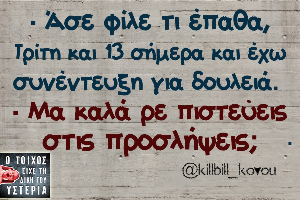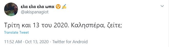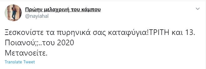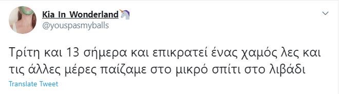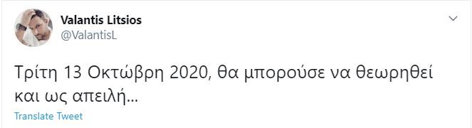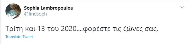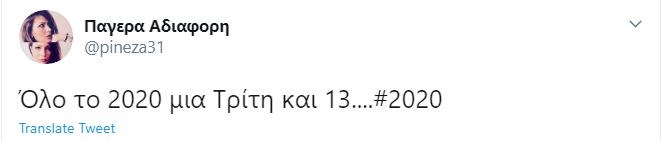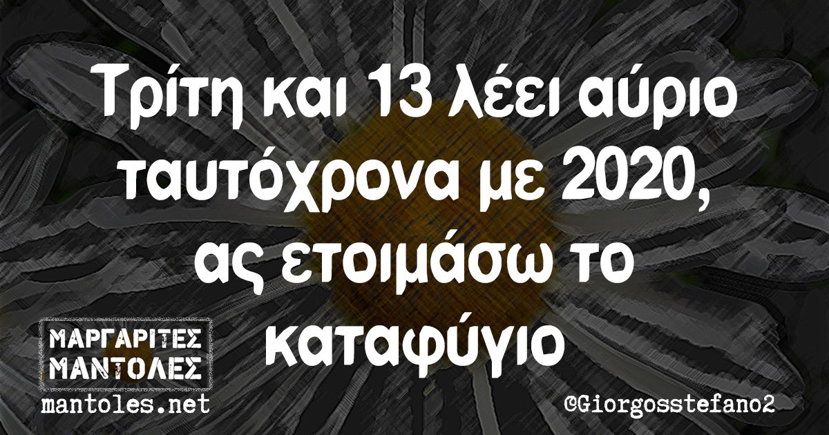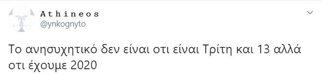 Με χιούμορ “ξορκίζουν” τη γρουσουζιά οι χρηστές του Twitter καθώς σήμερα είναι Τρίτη και 13 και μάλιστα όχι οποιουδήποτε έτους αλλά του 2020. Το hashtag #Τριτηκαι13 βρίσκεται ανάμεσα στα trends με τις αστείες ατάκες να κυριαρχούν. Ωστόσο δεν λείπουν και τα σχόλια για τις καταστροφές που άφησε πίσω της η κακοκαιρία αλλά και για την πρόταση της εισαγγελέως για τις ποινές της Χρυσής Αυγής.