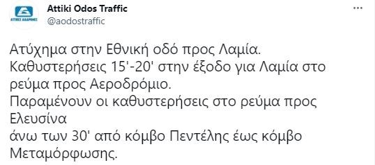 Η Αττική Οδός προειδοποιεί για καθυστερήσεις 15′-20′ στην έξοδο για Λαμία στο ρεύμα προς Αεροδρόμιο. Παραμένουν οι καθυστερήσεις στο ρεύμα προς Ελευσίνα άνω των 30′ από κόμβο Πεντέλης έως κόμβο Μεταμόρφωσης.