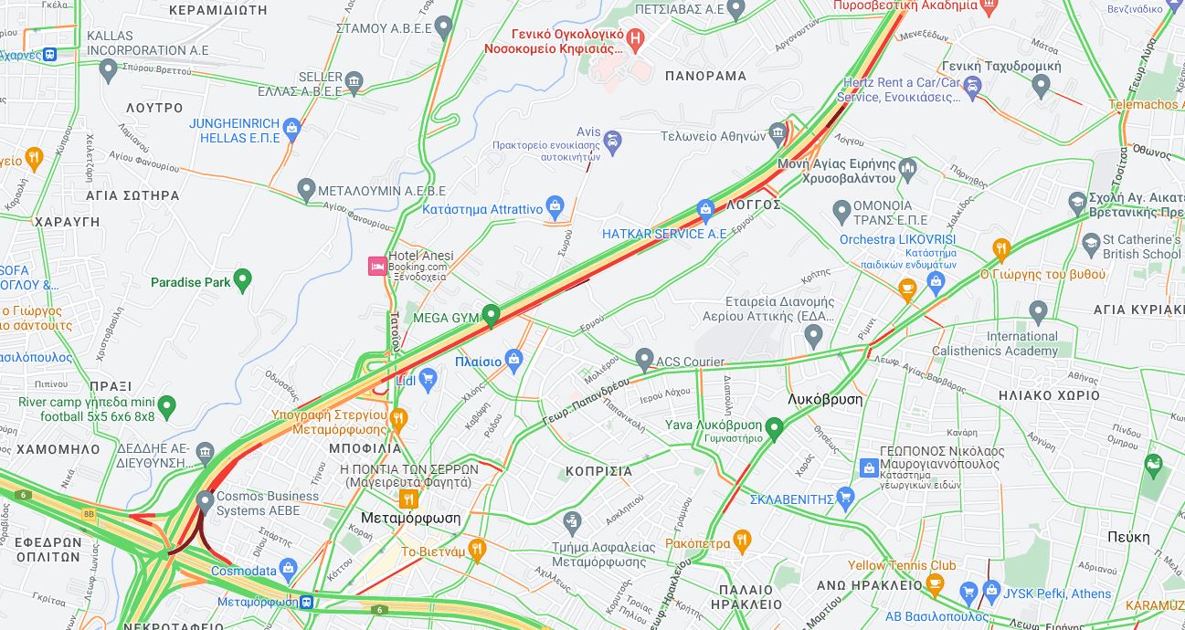 Η κίνηση, σύμφωνα με πληροφορίες από την Τροχαία, ξεκινά από το ύψος της Μεταμόρφωσης μέχρι την έξοδο για Θρακομακεδόνες.