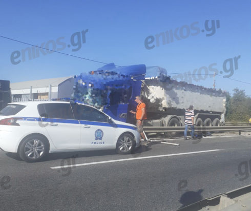Όπως φαίνεται στις φωτογραφίες που έστειλε αναγνώστης του enikos.gr, το παρμπρίζ της νταλίκας έχει σπάσει και η μηχανή ακουμπά στο στηθαίο, στο αντίθετο ρεύμα κυκλοφορίας.