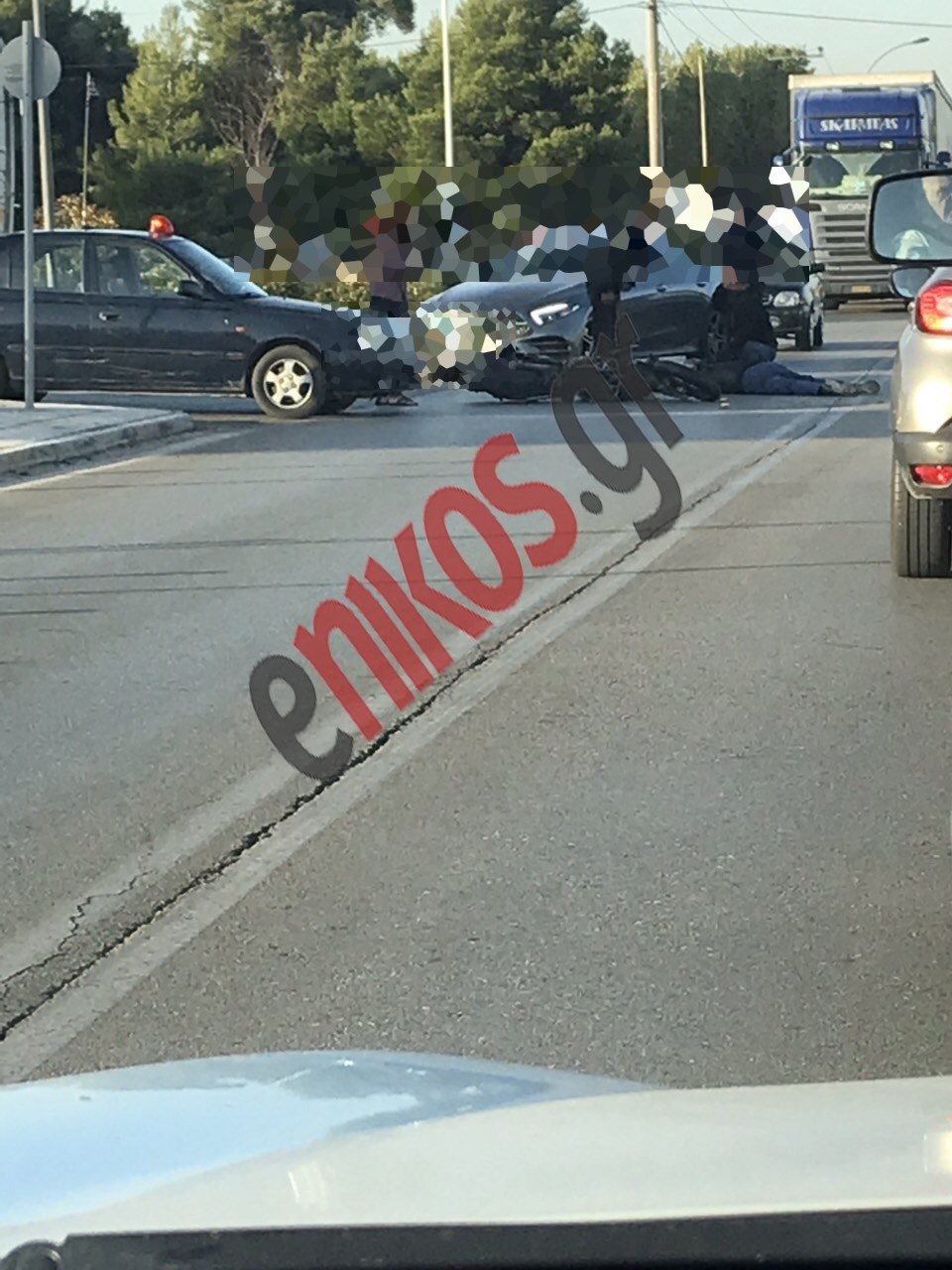 Όπως μπορείτε να δείτε και από τη φωτογραφία που έστειλε αναγνώστης στο enikos.gr, αποτέλεσμα του τροχαίου ήταν να τραυματιστεί ο οδηγός της μηχανής.