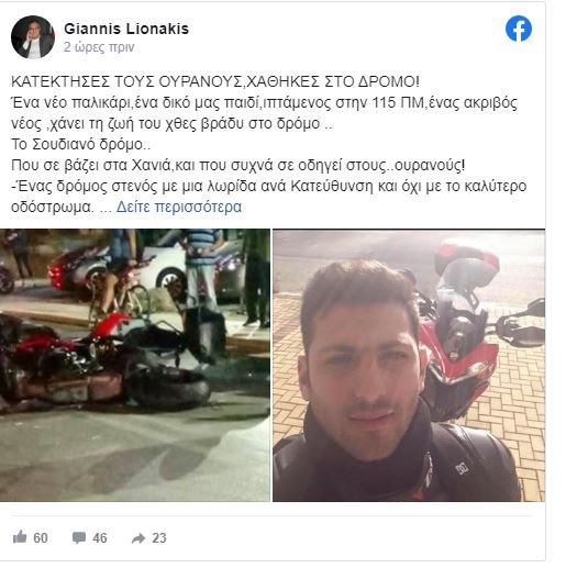 Ένα νέο παλικάρι,ένα δικό μας παιδί,ιπτάμενος στην 115 ΠΜ,ένας ακριβός νέος ,χάνει τη ζωή του χθες βράδυ στο δρόμο .. Το Σουδιανό δρόμο.. Που σε βάζει στα Χανιά,και που συχνά σε οδηγεί στους..ουρανούς!