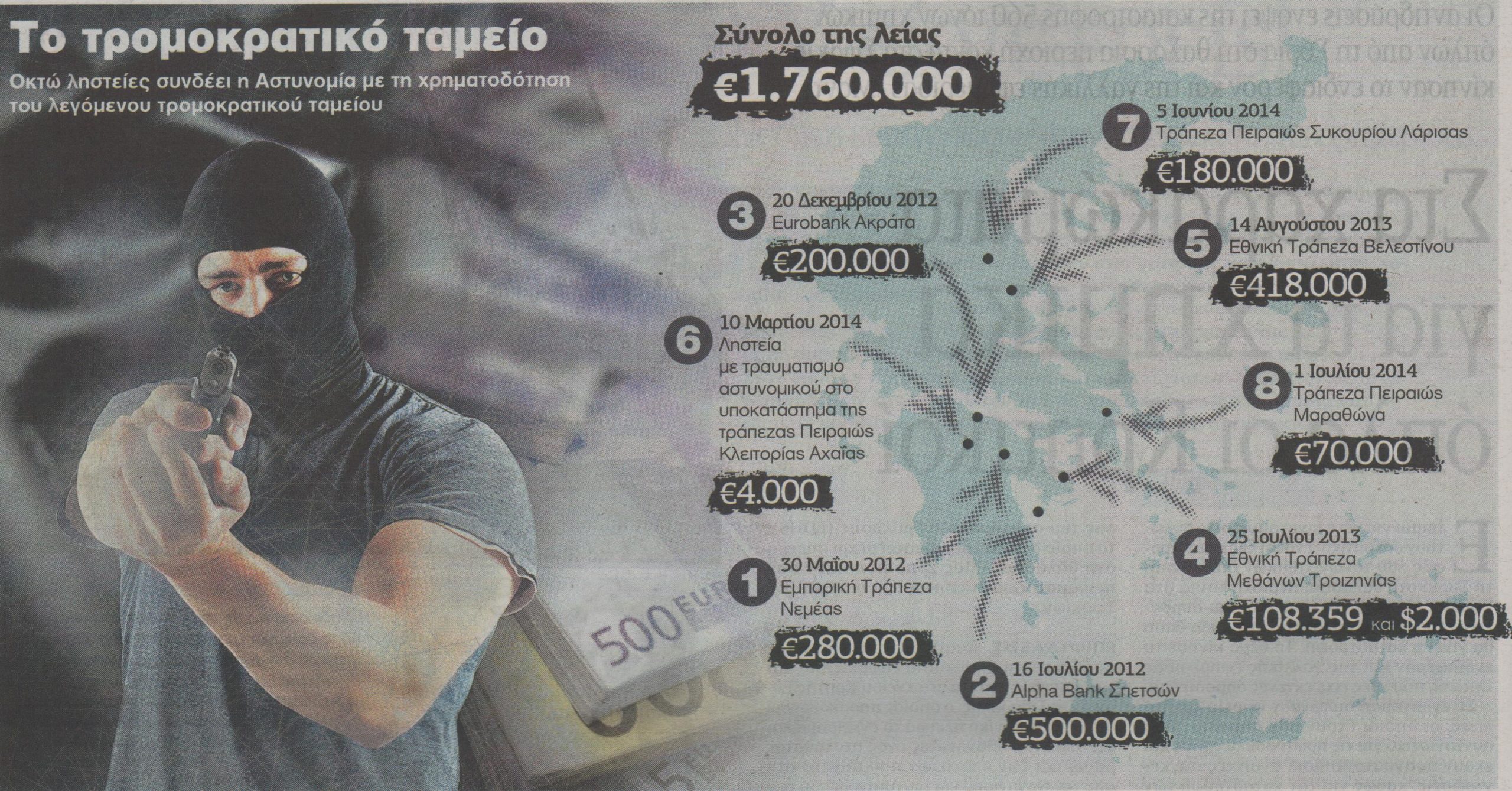 Από αυτές τις ληστείες, το ταμείο των τρομοκρατών έχει ενισχυθεί με περίπου 1.760.000 ευρώ, ποσό που εξασφαλίζει την διαβίωση των δραστών αλλά και την προετοιμασία χτυπημάτων.