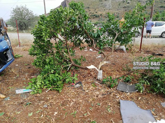 Στην τρελή πορεία που ακολούθησε το όχημα, προσέκρουσε πάνω στην περίφραξη του χωραφιού ενώ έκοψε και τρεις μικρές πορτοκαλιές.