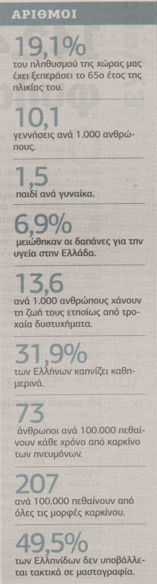 Με το 19,1% του πληθυσμού της χώρας μας να έχει ξεπεράσει το 65ο έτος της ηλικίας του, οι Ελληνες κατακτούν το… χάλκινο μετάλλιο μετά τη Γερμανία και την Ιταλία. Αντίστοιχα ανησυχητικά είναι και τα στοιχεία για τις γεννήσεις, καθώς το 2010 καταγράφτηκαν 10,1 γεννήσεις ανά 1000 ανθρώπους, ενώ σε κάθε Ελληνίδα αναλογούν μόλις 1,5 γεννήσεις.