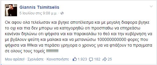 Αυτή ήταν η πρώτη ανάρτηση του Γιάννη Τσιμιτσέλη στην προσωπική του σελίδα στο Facebook λίγες ώρες μετά το κλείσιμο της κάλπης του δημοψηφίσματος.