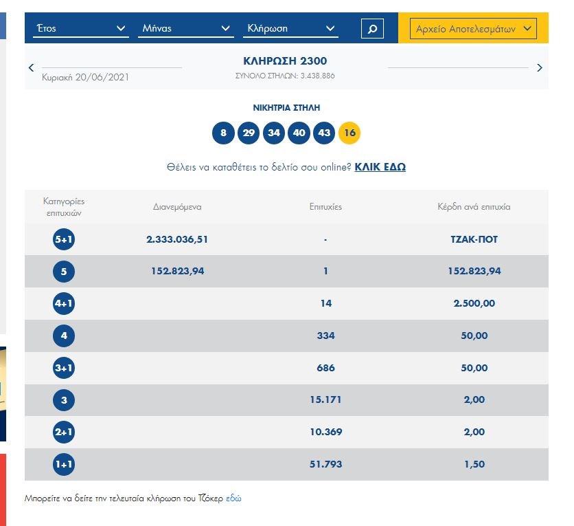 Τουλάχιστον 2.600.000 ευρώ μοιράζει απόψε το ΤΖΟΚΕΡ του ΟΠΑΠ στους τυχερούς της πρώτης κατηγορίας. Στην κλήρωση της Κυριακής σημειώθηκε τζακ ποτ. Οι τυχεροί αριθμοί ήταν: 8, 29, 34, 40, 43 και ΤΖΟΚΕΡ το 16.