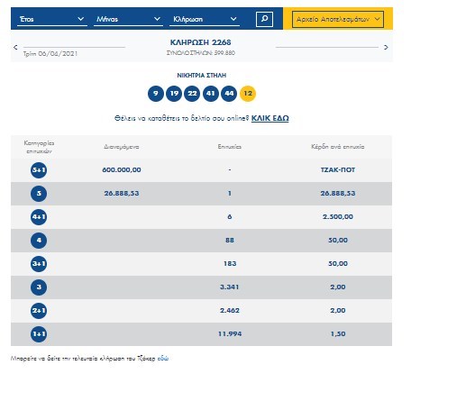 Οι τυχεροί αριθμοί της τελευταίας κλήρωσης ήταν: 9, 19, 22, 41, 44 και ΤΖΟΚΕΡ το 12.
