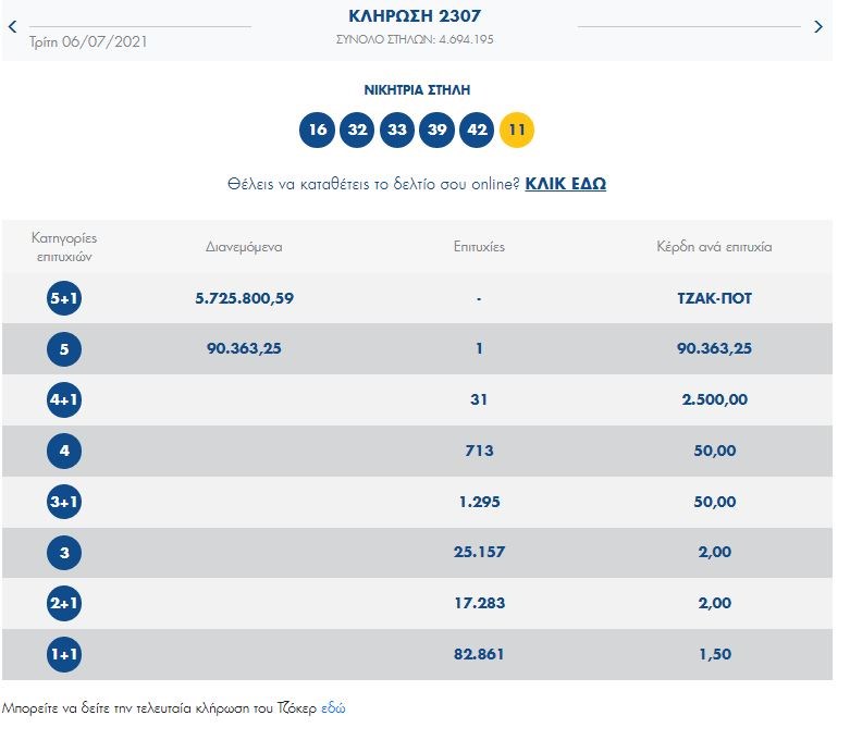 Τουλάχιστον 6.400.000 ευρώ μοιράζει απόψε το ΤΖΟΚΕΡ του ΟΠΑΠ στους τυχερούς της πρώτης κατηγορίας. Στην κλήρωση της Τρίτης σημειώθηκε το 15ο συνεχόμενο τζακ ποτ. Οι τυχεροί αριθμοί ήταν 16, 32, 33, 39, 42 και ΤΖΟΚΕΡ το 11.