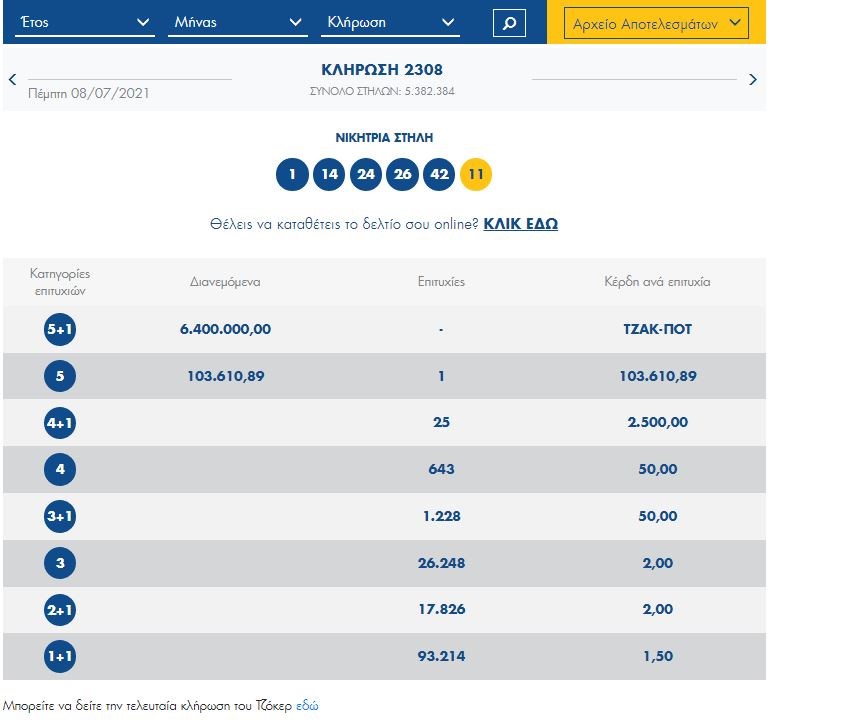 Τουλάχιστον 7.200.000 ευρώ μοιράζει απόψε το ΤΖΟΚΕΡ του ΟΠΑΠ στους τυχερούς της πρώτης κατηγορίας. Στην κλήρωση της Πέμπτης σημειώθηκε το 16ο συνεχόμενο τζακ ποτ. Οι τυχεροί αριθμοί ήταν 1, 14, 24, 26, 42 και ΤΖΟΚΕΡ το 11.
