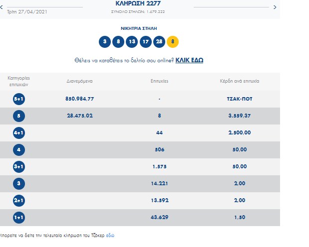 Τουλάχιστον 900.000 ευρώ μοιράζει απόψε το ΤΖΟΚΕΡ του ΟΠΑΠ στους τυχερούς της πρώτης κατηγορίας. Στην κλήρωση της Μεγάλης Τρίτης σημειώθηκε Τζακ ποτ. Οι τυχεροί αριθμοί ήταν 3,8,13,17,28 και ΤΖΟΚΕΡ το 8.