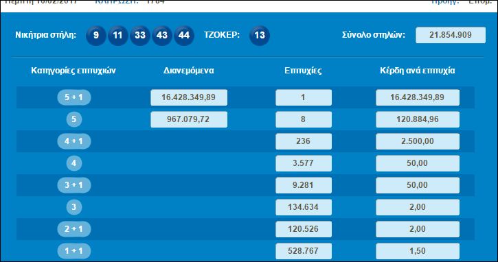 Έναν υπερτυχερό που κερδίζει το αστρονομικό ποσό των 16.428.349 ευρώ ανέδειξε η σημερινή κλήρωση του ΤΖΟΚΕΡ.