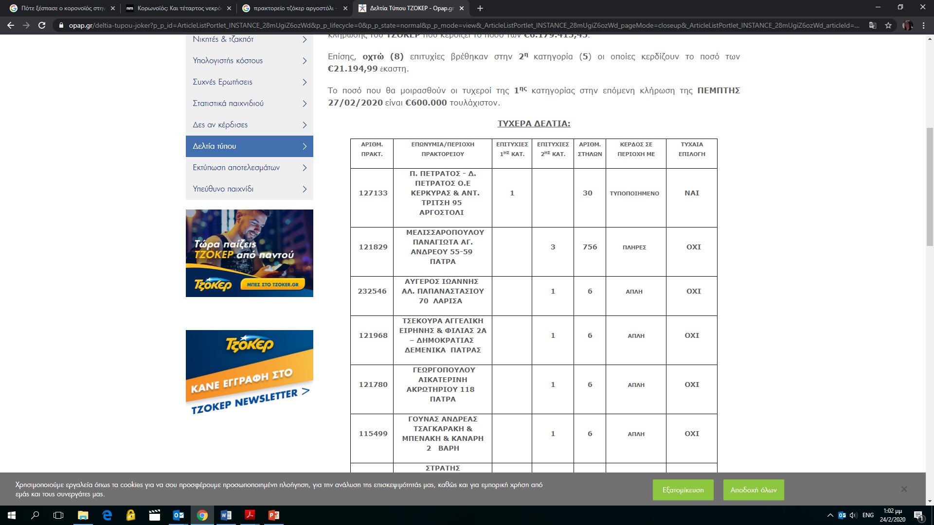 Σύμφωνα με τον κ. Πετράτο, ο υπερτυχερός δεν έχει ακόμα εμφανιστεί. Έγινε εκατομμυριούχος, παίζοντας ένα δελτίο αξίας 15 ευρώ, ενώ η νικητήρια στήλη προήλθε από τυποποιημένο σύστημα.