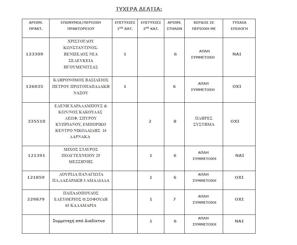Επίσης, έξι (6) επιτυχίες βρέθηκαν στην 2η κατηγορία (5) οι οποίες κερδίζουν το ποσό των €31.508,06 έκαστη.