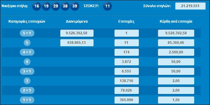 Έναν υπερτυχερό που κερδίζει το αστρονομικό ποσό των 9.526.392 ευρώ ανέδειξε η κλήρωση του ΤΖΟΚΕΡ. Οι τυχεροί αριθμοί είναι: 16, 19, 29, 38, 39 και ΤΖΟΚΕΡ το 11. Να σημειωθεί ότι είχαν προηγηθεί 11 συνεχή τζακ ποτ.