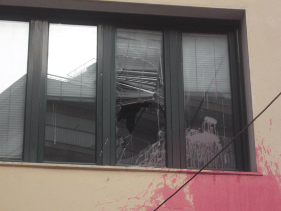 Άγνωστοι δράστες, πιθανότατα στη διάρκεια της νύχτας, πέταξαν έξι γυάλινα μπουκάλια με μπογιές στους εξωτερικούς τοίχους κυρίως του ισογείου του κτιρίου, καθώς και πέτρες σπάζοντας τζάμια του πρώτου ορόφου και προκαλώντας φθορές σε διάφορα αντικείμενα στον εσωτερικό χώρο.