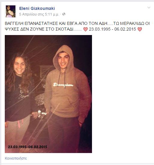 «Βαγγέλη επαναστάτησε και έβγα από τον Άδη… Των μερακλήδων οι ψυχές δεν ζούνε στο σκοτάδι. 23-03-1995 – 06-02-2015» έγραψε η Ελένη Γιακουμάκη στο facebook.