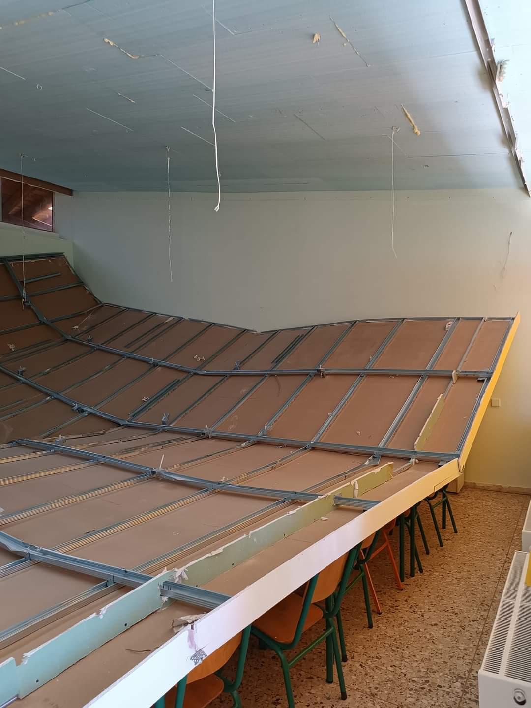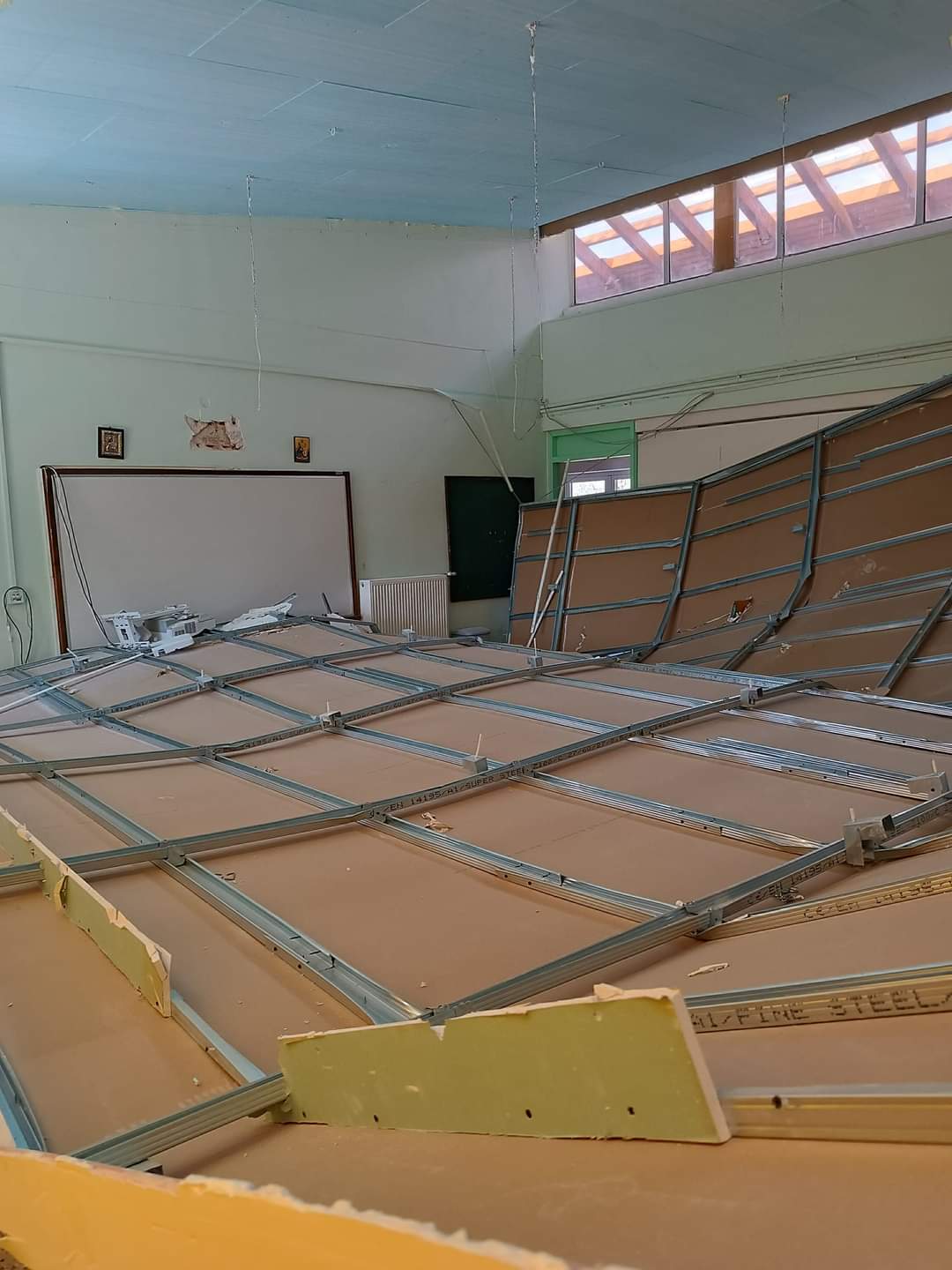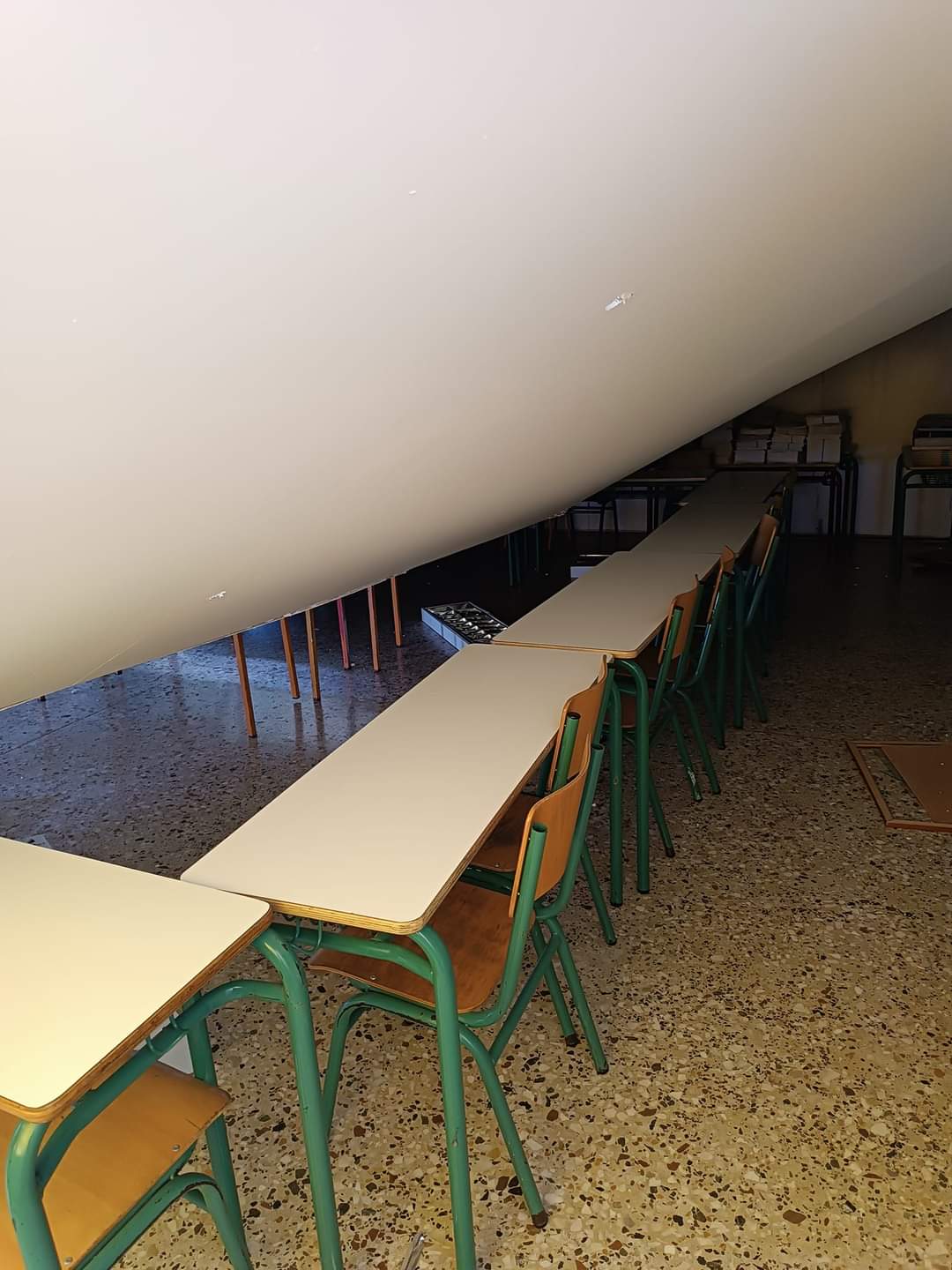 Κατέρρευσε ολόκληρη η ψευδοροφή μέσα στην αίθουσα σχολείου στον Βαρνάβα. «Θα είχαμε θύματα αν ήταν υπήρχαν παιδιά στην αίθουσα» λέει στο enikos.gr ο πρώην πρόεδρος της κοινότητας Σπύρος Ηλίας.