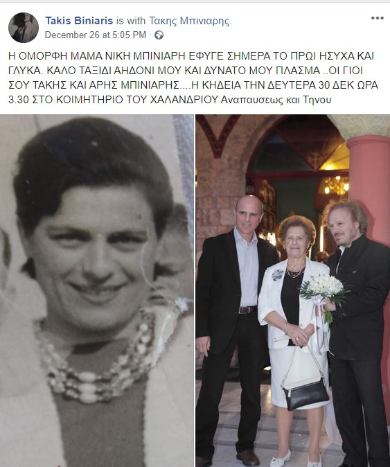 Η μητέρα του τραγουδιστή Τάκη Μπινιάρη έφυγε από τη ζωή ανήμερα των Χριστουγέννων.