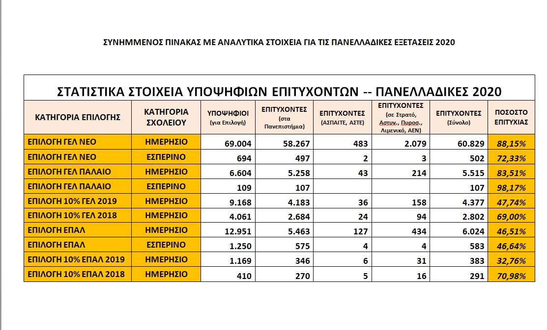 Συνολικά εισήχθησαν στα Πανεπιστήμια, στις Ανώτατες Εκκλησιαστικές Ακαδημίες, στην ΑΣΠΑΙΤΕ, στην ΑΣΤΕ, στις Στρατιωτικές και Αστυνομικές Σχολές και στις Ακαδημίες της Πυροσβεστικής, του Εμπορικού Ναυτικού και του Λιμενικού Σώματος 81.413 υποψήφιοι, ενώ το 2019 εισήχθησαν 80.696.