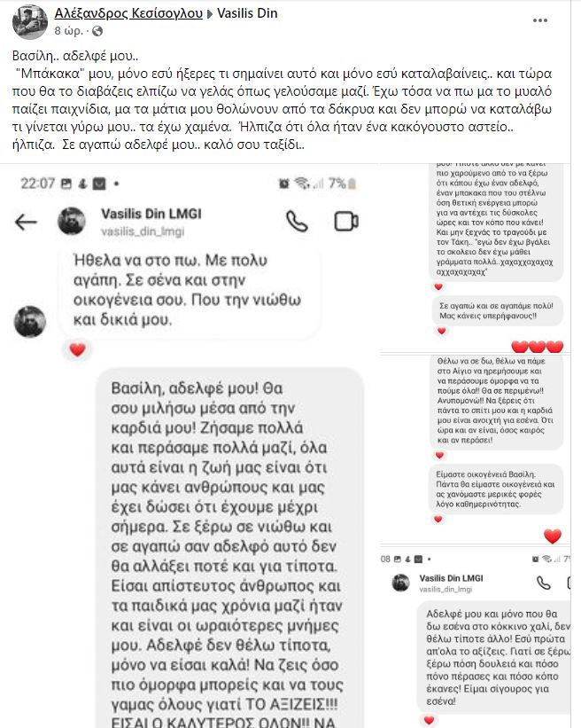 Ο ίδιος δημοσίευσε παλιότερα μηνύματα που είχε ανταλλάξει με τον άτυχο 33χρονο, γράφοντας: «Βασίλη… αδελφέ μου… “Μπάκακα” μου, μόνο εσύ ήξερες τι σημαίνει αυτό και μόνο εσύ καταλαβαίνεις. Και τώρα που θα το διαβάζεις ελπίζω να γελάς όπως γελούσαμε μαζί. Έχω τόσα να πω μα το μυαλό παίζει παιχνίδια, μα τα μάτια μου θολώνουν από τα δάκρυα και δεν μπορώ να καταλάβω τι γίνεται γύρω μου… τα έχω χαμένα. Ήλπιζα ότι όλα ήταν ένα κακόγουστο αστείο… ήλπιζα. Σε αγαπώ αδελφέ μου… καλό σου ταξίδι…»