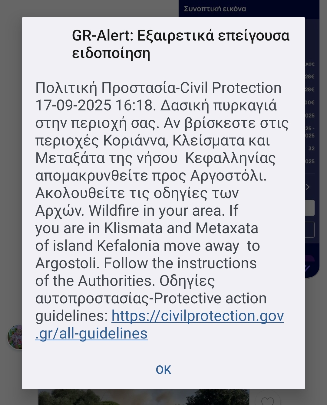 «Δασική πυρκαγιά στην περιοχή σας. Αν βρίσκεστε στις περιοχές Κοριάννα, Κλείσματα και Μεταξάτα της νήσου Κεφαλληνίας απομακρυνθείτε προς Αργοστόλι. Ακολουθείτε τις οδηγίες των Αρχών» ανέφερε το μήνυμα της Πολιτικής Προστασίας.