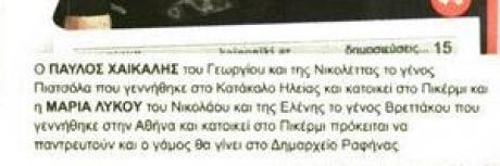 Ο Παύλος Χαϊκάλης και η αστυνομικός Μαρία Λύκου, η οποία ήταν και η προσωπική φρουρός του γνωστού ηθοποιού, όταν αυτός ήταν υφυπουργός, δημοσίευσαν την αναγγελία του γάμου τους σε εφημερίδα, ακολουθώντας την τυπική διαδικασία.