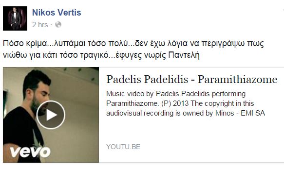 «Πόσο κρίμα… λυπάμαι τόσο πολύ… δεν έχω λόγια να περιγράψω πως νιώθω για κάτι τόσο τραγικό… έφυγες νωρίς Παντελή» έγραψε στον προσωπικό του λογαριασμό στο facebook ο τραγουδιστής και ανέβασε το τραγούδι του Παντελή Παντελίδη “Παραμυθιάζομαι”.
